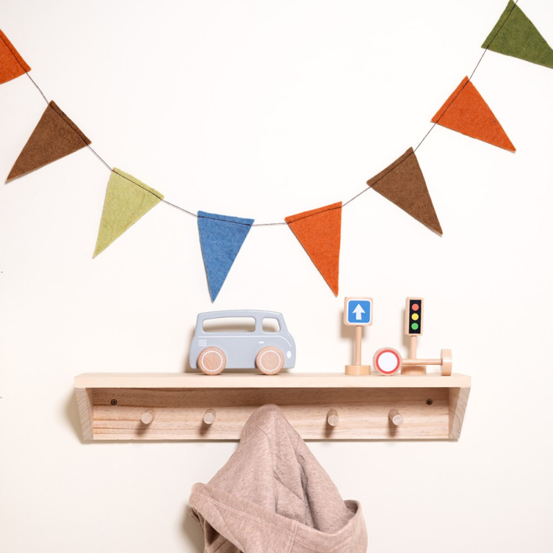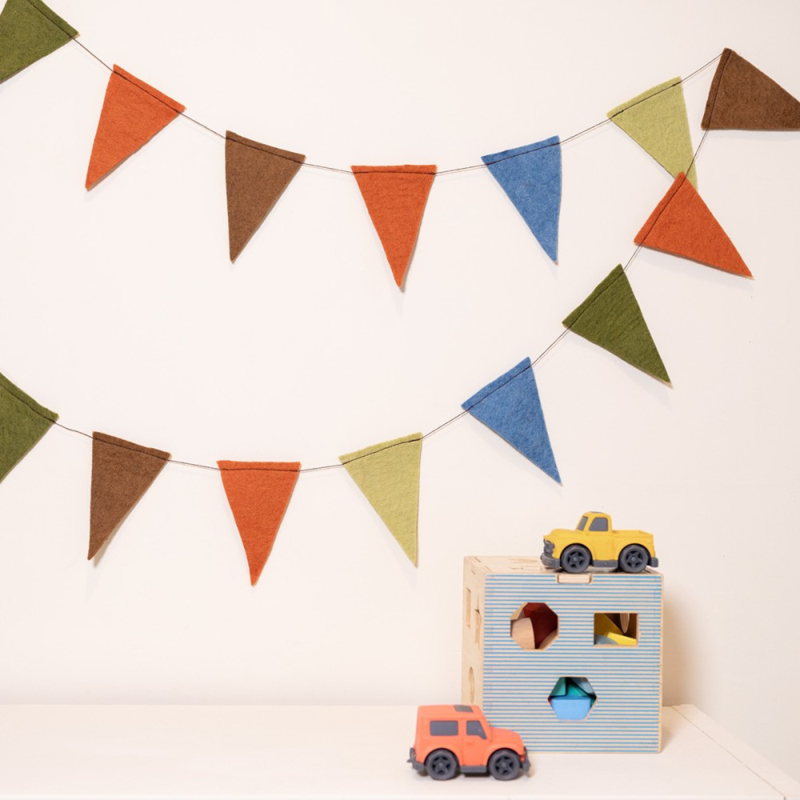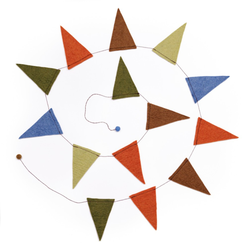 OverzichtSlinger met vilten vlaggetjes in de kleuren groen, blauw en bruin. Handgemaakt in Nepal. Leuk als verjaardagsdecoratie of in een kinderkamer.