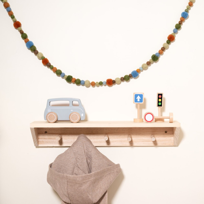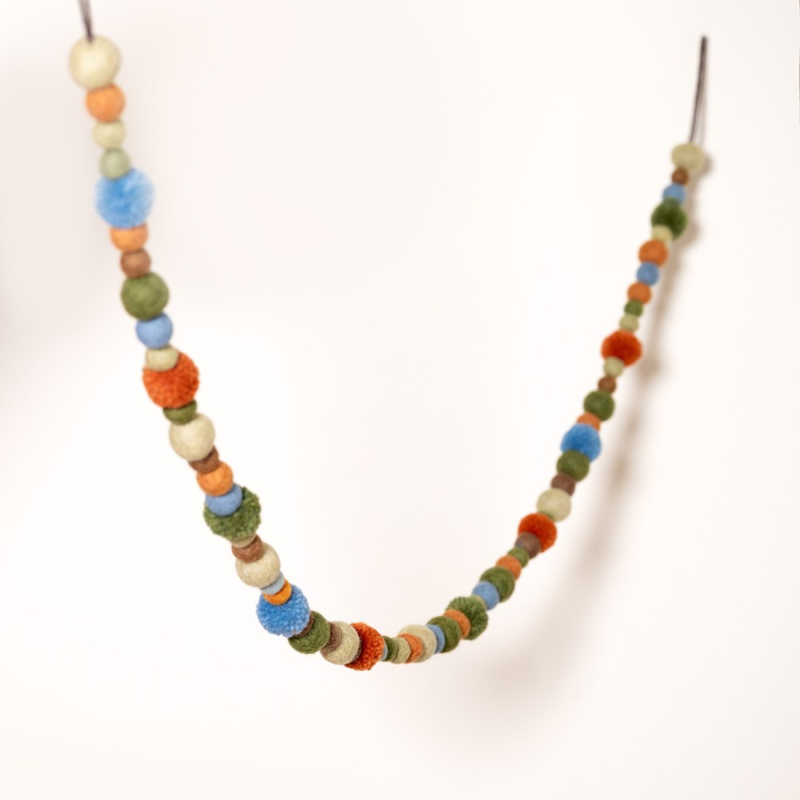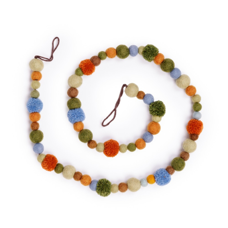 OverzichtSlinger met viltballetjes en pompoms in blauw-, groen- en bruintinten. Heel leuk als decoratie in de kinderkamer. Past mooi bij de auto slinger en de vlaggenlijn in deze tinten.