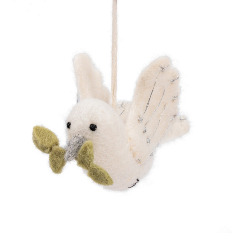 Hanger Sjaal met Verhaal vogel vredesduif met takjeOp de witte duifjes van wolvilt zijn sterretjes geborduurd met een zilveren draad. Een prachtig cadeautje als symbool van vrede. Deze duif doet het ook heel goed in de kerstboom!
